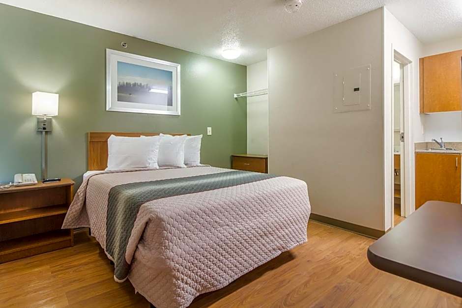 This nonsmoking studio features a kitchen, dining room, work area and a queen-sized bed.